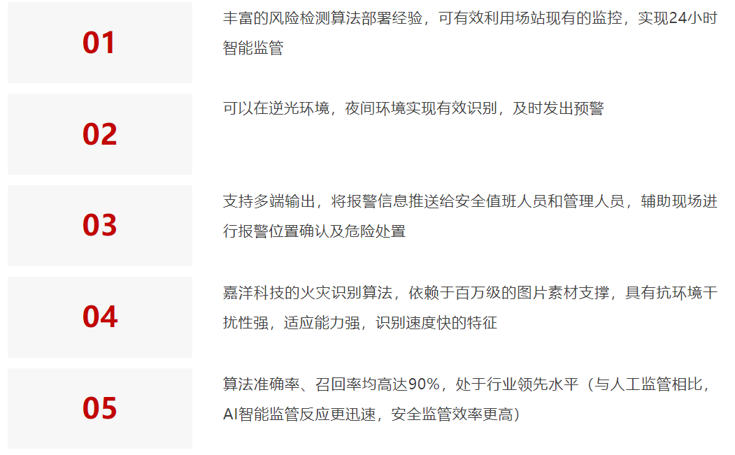 此次火情发生在较为偏远的地区,恰恰是人员安全监管相对薄弱的环节,嘉洋科技视频智能分析系统的应用可有效辅助现场决策,显著减少了值班人员状态和素质对监管效率的影响,从而有效弥补了在生产现场盲区安全管理上的不足。